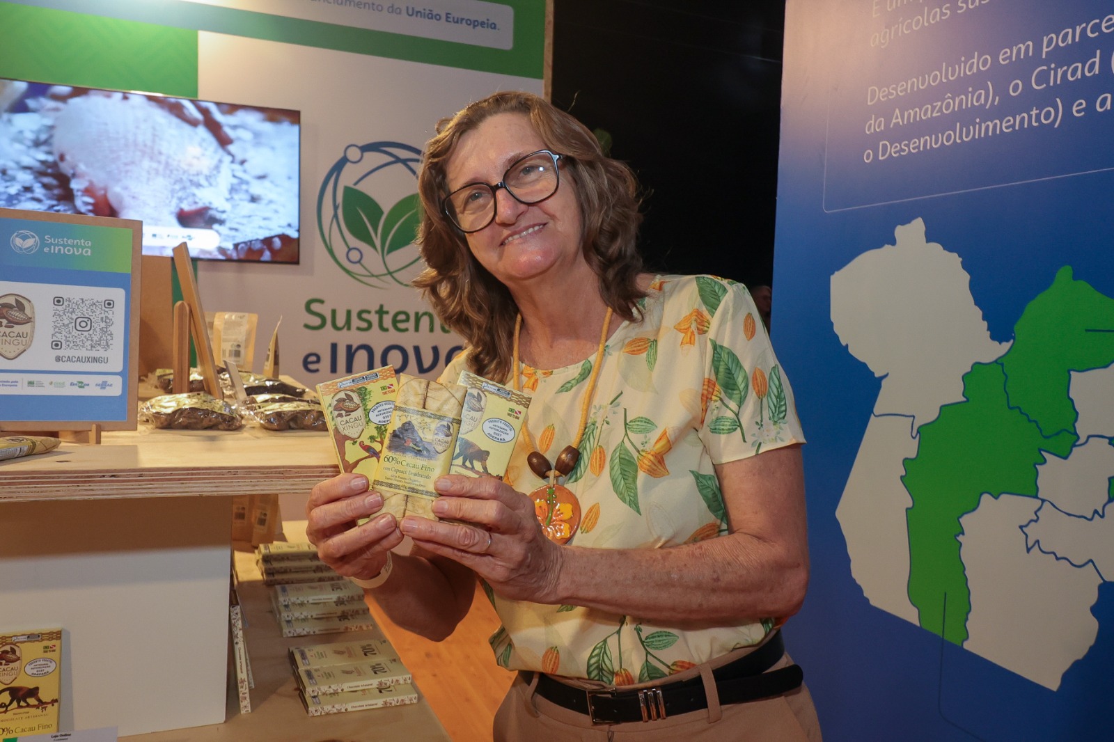 Barras de chocolate 70%, de sabor intenso, com apenas dois ingredientes: cacau orgânico e açúcar orgânico. Chocolate 60% com castanha-do-Pará e cumaru, além do chocolate 60% com cupuaçu, embalado na folha de cacau desidratada. Esses são alguns dos produtos da marca Cacau Xingu, de Brasil Novo, expostos no espaço Sustenta e Inova, na En-Zone, a Zona do Empreendedorismo do Sebrae na COP30, no Parque Urbano Belém Porto Futuro I.