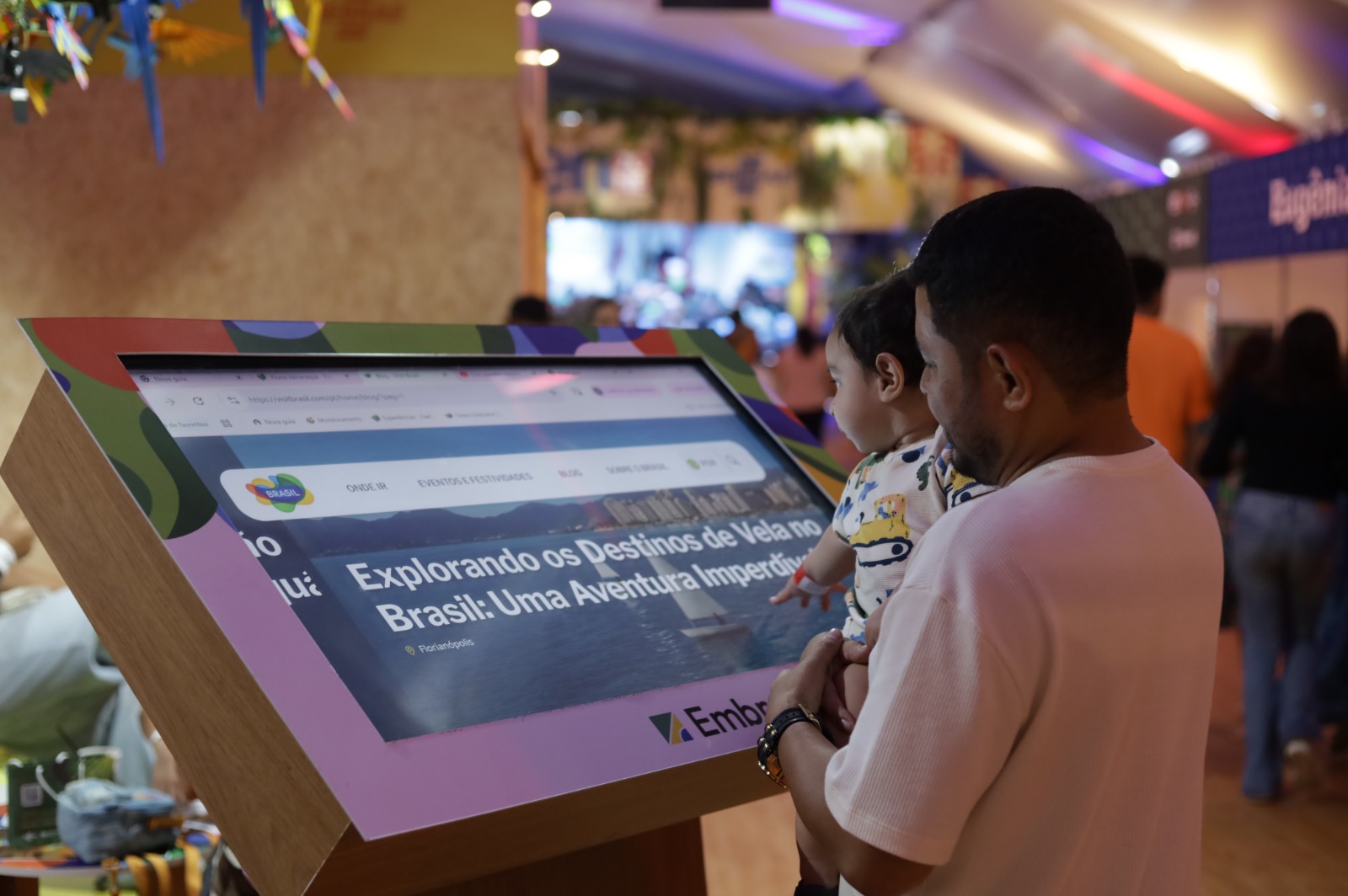 Também foi adicionado um totem interativo que funciona como um quiz, no qual os participantes respondem a perguntas sobre destinos turísticos brasileiros. Ao final, é gerada uma foto em formato de cartão postal, personalizada de acordo com as respostas do participante, e enviada diretamente para o WhatsApp do mesmo.